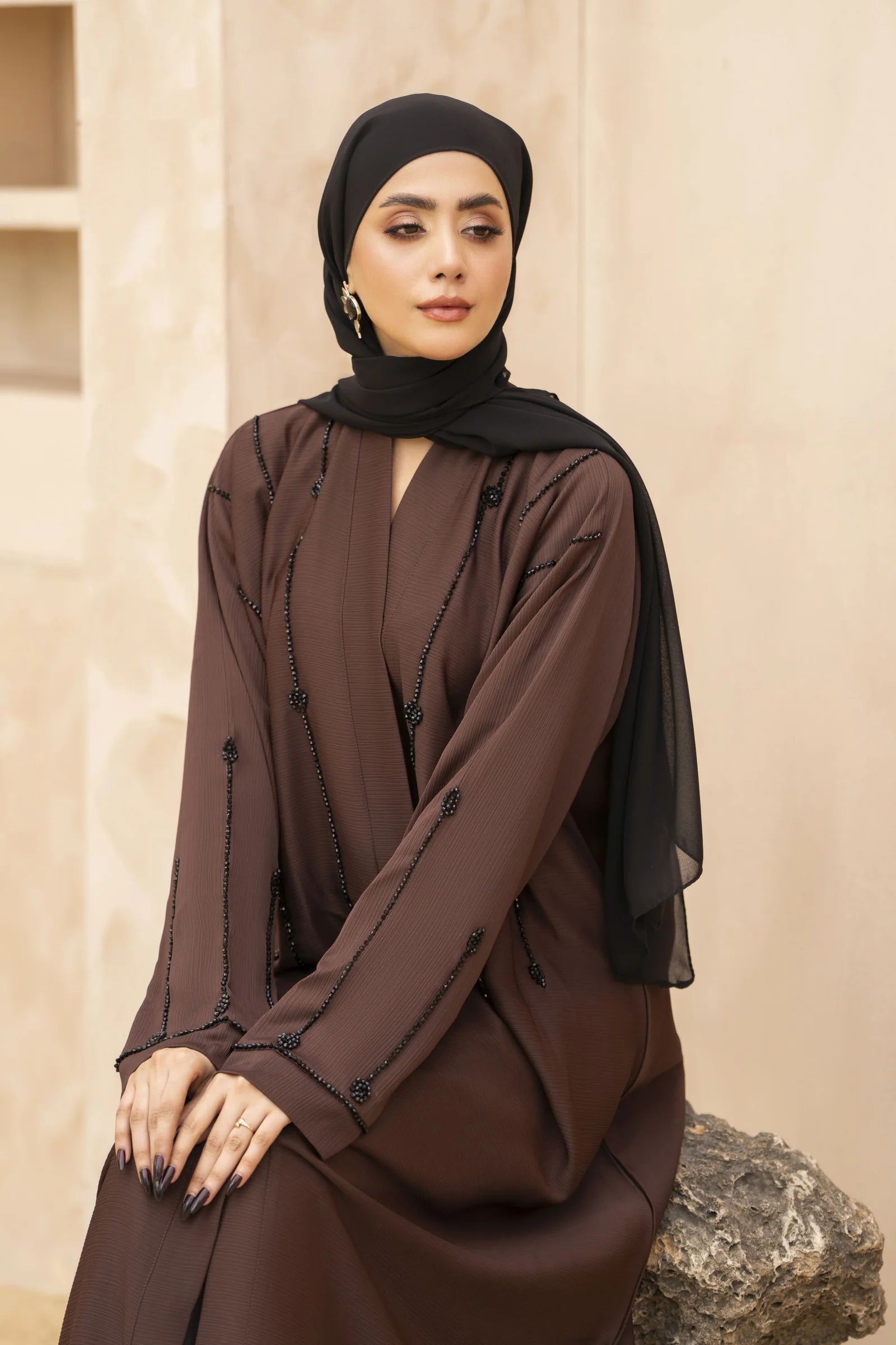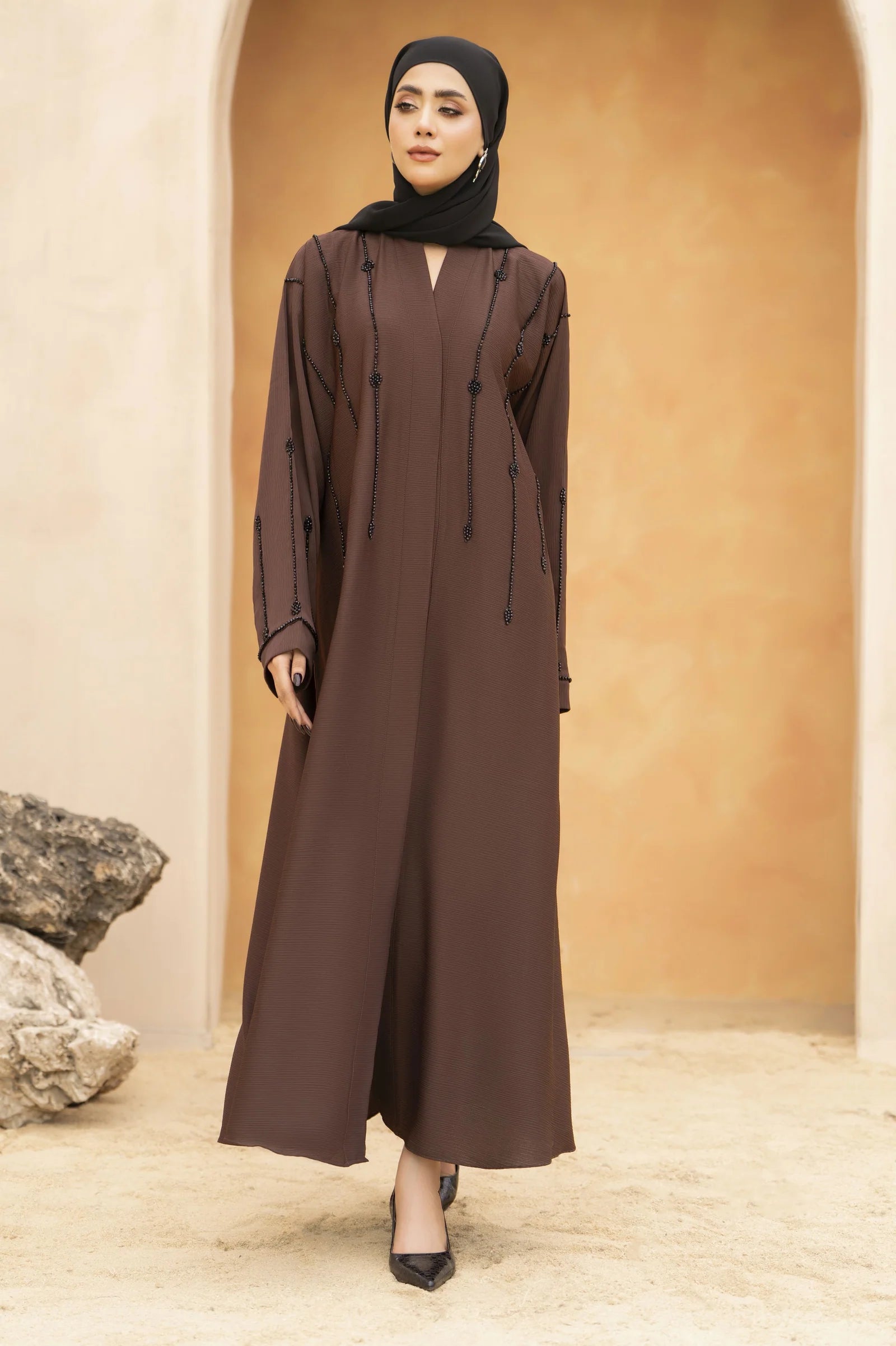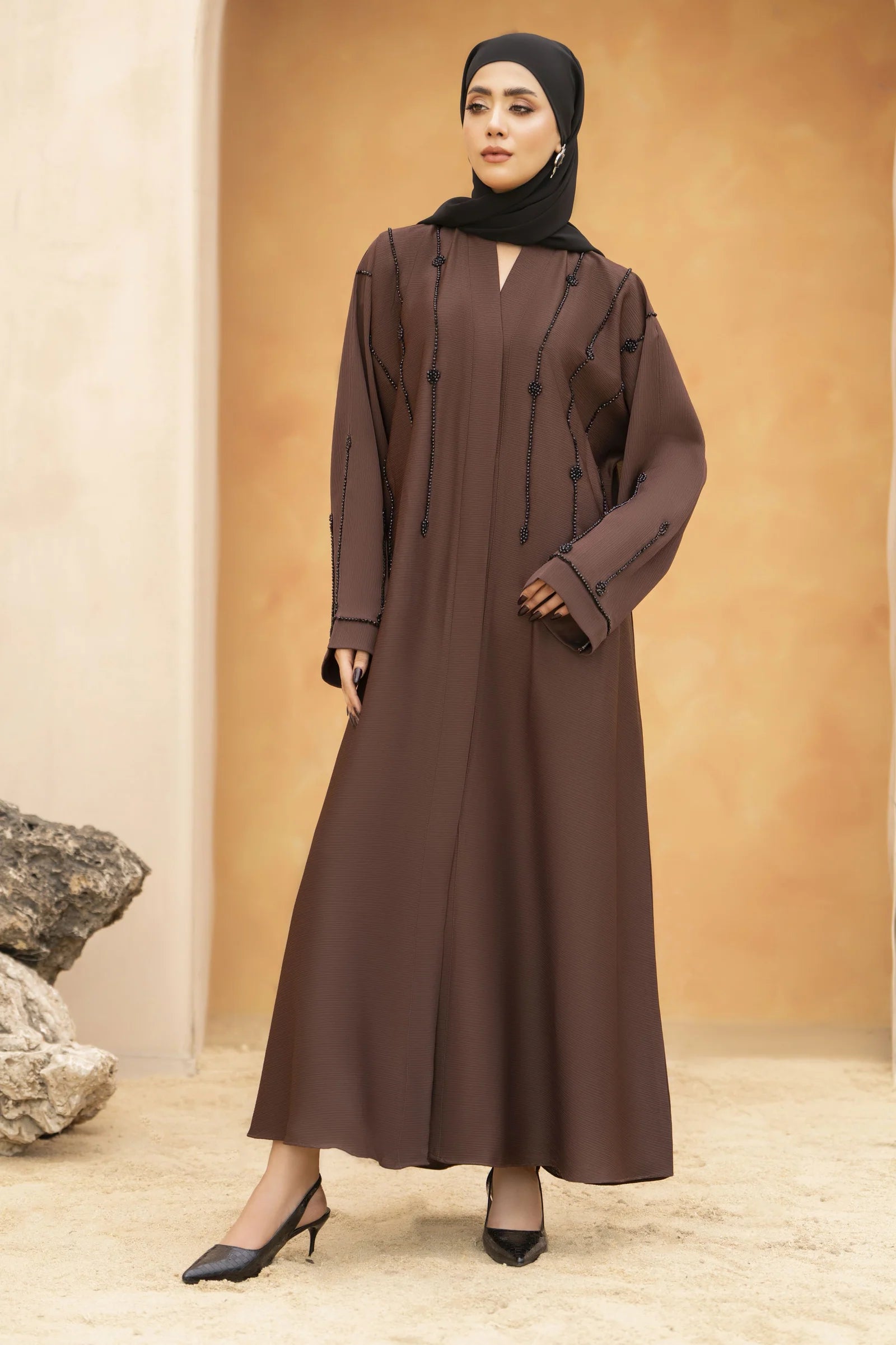 The rich mocha brown hue brings warmth and sophistication, making it a versatile choice for Eid, formal occasions, and graceful everyday wear. With its fluid drape and timeless cut, this abaya offers both comfort and understated luxury.